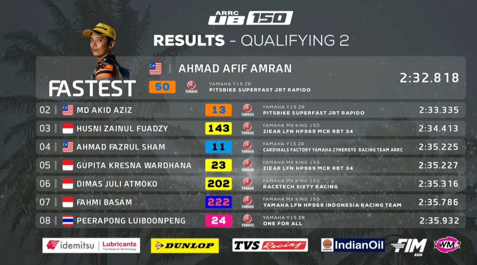 Pembalap Malaysia Ahmad Afif Amran (Pitsbike Superfast JRT Rapido) tampil tercepat dengan catatan waktu 2:32.818, sekaligus memastikan diri memimpin daftar 10 besar yang akan tampil di Superpole nanti.